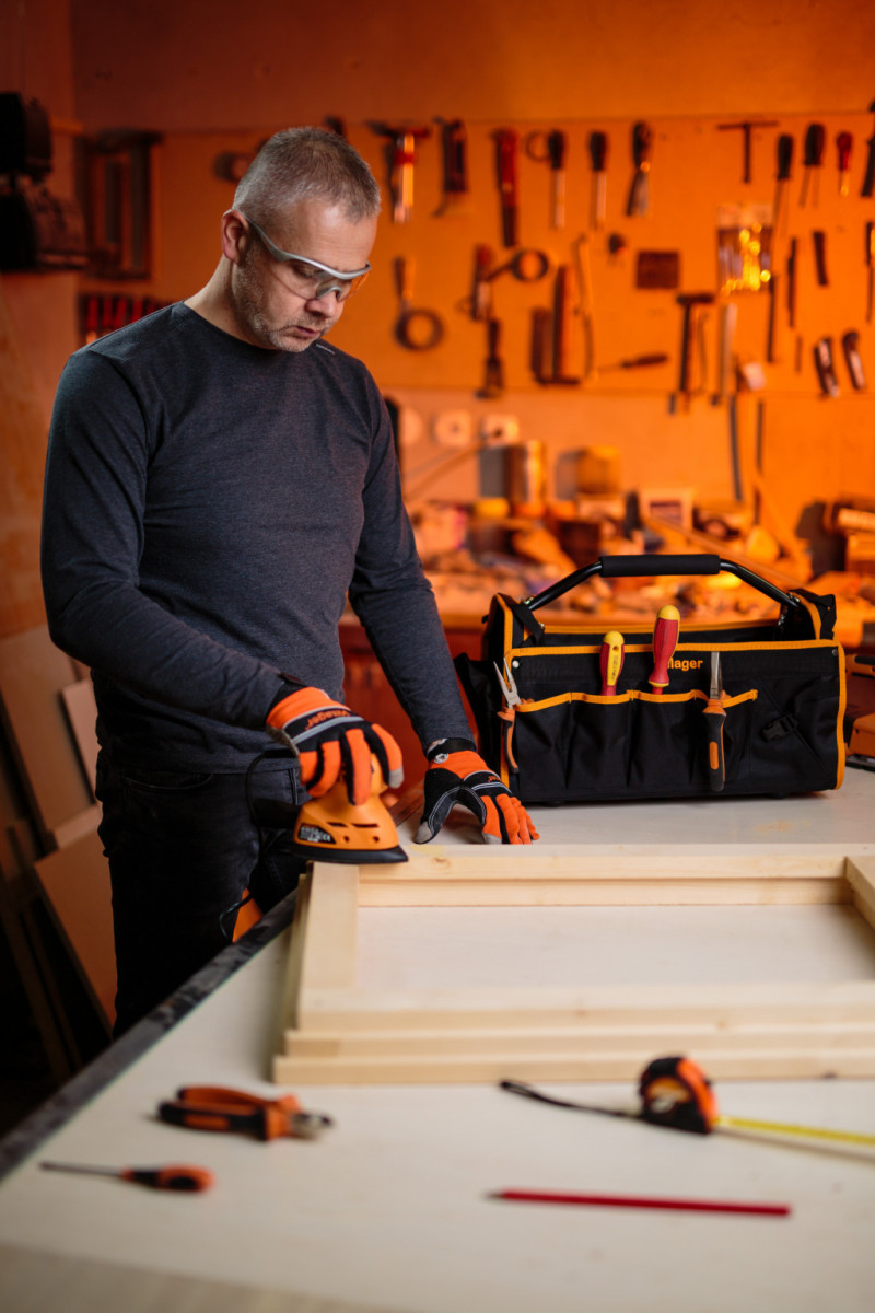 Villager ugaona vibraciona brusilica iz serije alata VLN sa 125W snažnim motorom i radnom površinom od 140 × 140 × 80 mm.